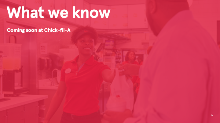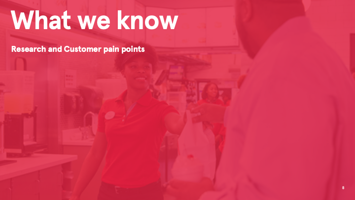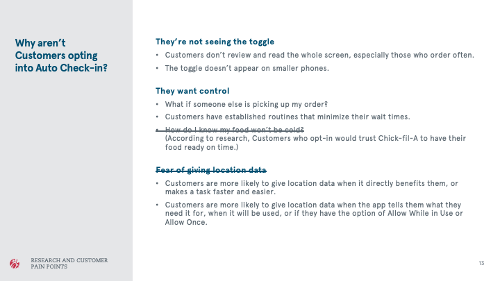 In order to ensure everyone was on the same page, I presented the research I conducted from usertesting.com, and included screenshots from app store reviews for Chick-fil-A’s app as well as other fast food ordering apps. I presented our goals and timeline for checking-in, in general, including physical improvements to the restaurants themselves.