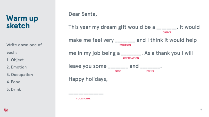 My slide deck for facilitating the workshop. I prefer not to make my slides bullet points, because no one wants to hear the speaker read verbatim off of a PowerPoint.